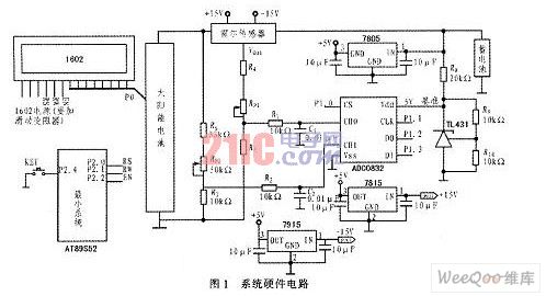 單片機正常運行需要為片內的晶體管或場效應管供給電源,使其工作在相應狀態。AT89S52需要一個5V電源(實際工作電壓為3.6~6.0V)。可用整流、穩壓方式供電,獲得4.5V左右的電壓,因本系統為獨立發電,且長期使用,考慮到電源壽命,該裝置由市電或干電池提供驅動電源不符合實際,所以最佳方案應該由系統內部太陽能電池的蓄電池供電,經穩壓集成塊7805穩壓為5V,輸入單片機Vcc引腳,驅動單片機及液晶顯示裝置。TBCl0SY霍爾電流傳感器,需±15V雙電源供電,同樣采用系統內的蓄電池供電.經穩壓集成塊7805、7915穩壓在±15V,從而驅動其工作。