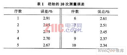 以200W的小型離網光伏系統為例,額定電壓24V,最大電流6.18A,蓄電池200Ah。設計正常放電時間為2~3d,0~6.18A的電流按比例轉換為0~5V的電壓,由2只電阻構成的衰減器,輸出電壓放大比例由電阻R1和R2的比值決定,設定U/U轉換比例為5/24,則R7=10kΩ,R6+Rp2=48kΩ。根據電量計算公式Q=UIT,實驗時間為中午12時至下午2時,從顯示電量開始,每隔3min記錄一次實際功率和監控系統所顯示的數據,各次誤差均小于3%,表l給出初始的10次測量誤差情況,隨電量逐漸增大,誤差變化范圍逐漸縮小。