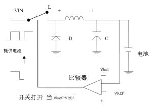 快速調(diào)節(jié)器的操作是通過控制一個晶體管開關(guān)的占空比來實現(xiàn)的。占空比會自動增加以使電池流入更多的電流。當(dāng)VBATT<VREF時,一個比較器會將開關(guān)閉合(參見圖5a),電流流入電池和電容C,這個電流同時也存儲在電感L中。VBATT持續(xù)升高,直到超過VREF,調(diào)節(jié)此時比較器將開關(guān)斷開(參見圖5b),存儲在電感中的電流迅速下降直到二極管偏置,使得電感電流以減速度流入電池,電容C在電感電流衰減后開始放電。并且最后VBATT開始下降,當(dāng)VBATT低于VREF時,比較器再次將開關(guān)閉合并開始另一次循環(huán)。在較大的范圍內(nèi)如果減小占空縮短閉合的時間,平均電壓就會下降,反之亦然。因此可以通過控制占空比的方法調(diào)節(jié)電壓或電流至所需要的值。