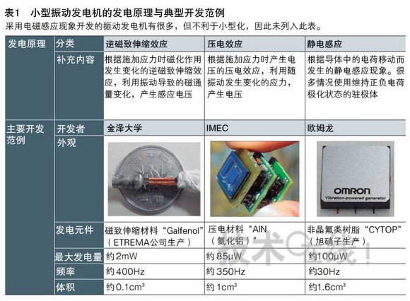 日本金澤大學(xué)上野敏幸副教授開發(fā)出了尺寸雖小卻可獲得較大發(fā)電量的振動(dòng)發(fā)電機(jī)。盡管外形尺寸僅為約2mm×3mm×12mm,但振動(dòng)頻率達(dá)到約400Hz時(shí)卻可獲得約2mW的發(fā)電量(表1)。