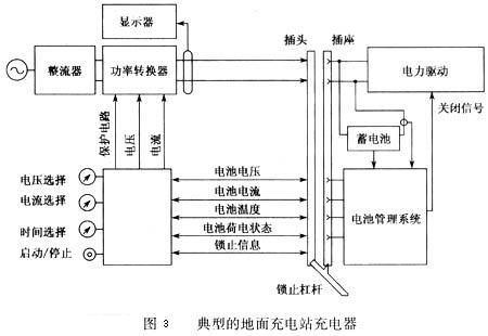 圖3為一典型的地面充電站中充電器的方案,該充電器由一個(gè)能將輸人的交流電轉(zhuǎn)換為直流電的整流器和一個(gè)能調(diào)節(jié)直流電功率的功率轉(zhuǎn)換器組成,通過把帶電線的插頭插入電動汽車上配套的插座中,直流電能就輸入蓄電池對其充電。充電器設(shè)置了一個(gè)鎖止杠桿以利于插入和取出插頭,同時(shí)杠桿還能提供一個(gè)確定已經(jīng)鎖緊的信號以確保安全。根據(jù)充電器和車上電池管理系統(tǒng)相互之間的通訊,功率轉(zhuǎn)換器能在線調(diào)節(jié)直流充電功率,而且充電器能顯示充電電壓、充電電流、充電量和充電費(fèi)用等。