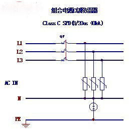 對(duì)于站內(nèi)組合電源系統(tǒng)的防雷,其防雷電路比較簡單,也比較成熟,根據(jù)‘郵標(biāo)’,在組合電源系統(tǒng)交流側(cè)采用通流容量為40kA(8/20μS波形)的 “3+1”方式的交流C級(jí)防雷器,在組合電源的直流側(cè)采用通流容量為15kA(8/20μS波形)的“1+1”方式的直流防雷器即可。
