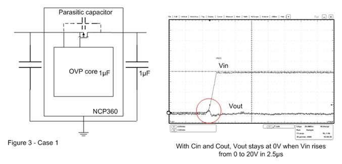 在圖3的案例2中,輸出電容已被移除。這樣,當OVP器件輸入端出現快速輸入瞬態現象時,旁路元件將保持開路。這時可以在輸出端觀察到過 沖,這個過沖可能會損壞連接至OVP輸出端的電子元器件。為了解決這個問題,必須在輸出引腳上連接一個輸出電容,并盡量靠近OVP器件擺放。