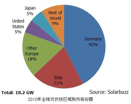 2010年,全球前五大光伏市場(chǎng)國家為德國、意大利、捷克共和國、日本與美國,這五個(gè)國家占據(jù)了全球80%的需求。其中歐洲地區(qū)光伏市場(chǎng)規(guī)模為14.7GW,占據(jù)全球81%的需求。歐洲區(qū)域前三大光伏市場(chǎng)國家依序?yàn)榈聡⒁獯罄c捷克共和國,此三國家市場(chǎng)規(guī)模共計(jì)12.9GW。2010年日本與美國市場(chǎng)的增長(zhǎng)非常迅速,年成長(zhǎng)分別達(dá)到101%與96%。總體來說,2010年超過100個(gè)國家為光伏產(chǎn)業(yè)需求的迅猛增長(zhǎng)做出了貢獻(xiàn)。