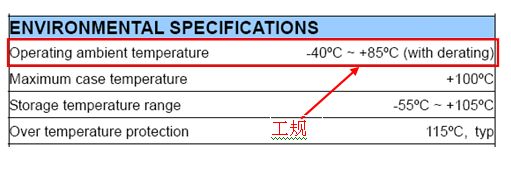 一般溫度操作可分成商規(0℃~+60℃)、工規(-25℃~+71℃)、軍規(-55℃~+85℃)等,在選擇DC/DC 電源模塊時需考慮實際系統操作溫度范圍,選用合適的溫度等級。