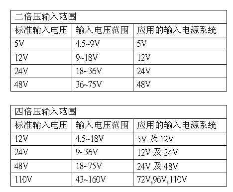 在選用電源模塊輸入電壓范圍時,視輸入電壓變動范圍,業界有二倍壓輸入及四倍壓輸入可選擇,電壓范圍如下: