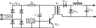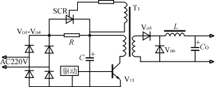該電路如圖3所示。在電源瞬時接通時,輸入電壓經整流橋VD1VD4和限流電阻R對電容器C充電。當電容器C充電到約80%的額定電壓時,逆變器正常工作,經主變壓器輔助繞組產生晶閘管的觸發信號,使晶閘管導通并短路限流電阻R,開關電源處于正常運行狀態。
