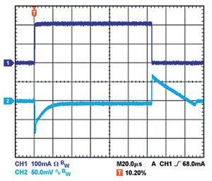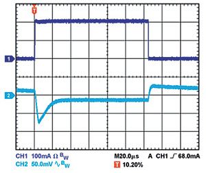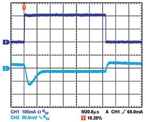 輸出電容還會影響調節器對負載電流變化的響應。控制環路的大信號帶寬有限,因此輸出電容必須提供快速瞬變所需的大多數負載電流。當負載電流以500mA/μs的速率從1mA變為200mA時,1μF電容無法提供足夠的電流,因而產生大約80mV的負載瞬態,如圖1所示。當電容增加到10μF時,負載瞬態會降至約70mV,如圖2所示。當輸出電容再次增加并達到20μF時,調節器控制環路可進行跟蹤,主動降低負載瞬態,如圖3所示。這些示例都采用線性調節器ADP151,其輸入和輸出電壓分別為5V和3.3V。