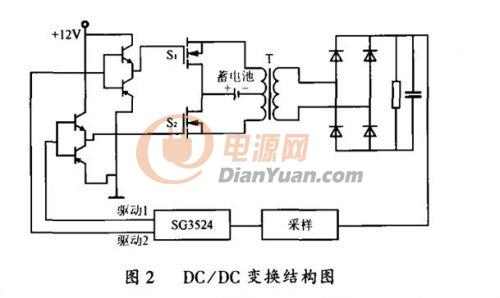 目前,構(gòu)成DC/AC逆變的新技術(shù)很多,但是考慮到具體的使用條件和成本以及可靠性,本電源仍然采用典型的二級(jí)變換,即DC/DC變換和DC/AC逆變。首先由DC/DC變換將DC12V電壓逆變?yōu)楦哳l方波,經(jīng)高頻升壓變壓器升壓,再整流濾波得到一個(gè)穩(wěn)定的約320V直流電壓;然后再由DC/AC變換以方波逆變的方式,將穩(wěn)定的直流電壓逆變成有效值稍大于220V的方波電壓;再經(jīng)LC工頻濾波得到有效值為220V的50Hz交流電壓,以驅(qū)動(dòng)負(fù)載。