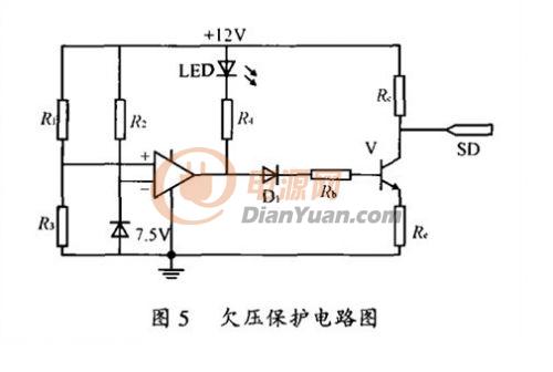 欠壓保護(hù)電路如圖5所示,它監(jiān)測(cè)蓄電池的電壓狀況,如果蓄電池電壓低于預(yù)設(shè)的10.8V,保護(hù)電路開始工作,使控制器SG3524的腳10關(guān)斷端輸出高電平,停止驅(qū)動(dòng)信號(hào)輸出。