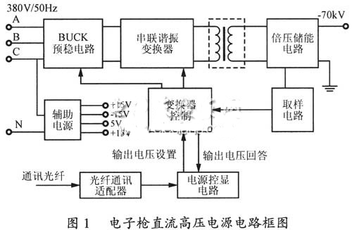 由于70kV直流高壓電源輸出要求穩定度和動態響應高,同時電源輸出高壓部分絕緣設備要求嚴格,為了減小電源的體積、減輕重量、降低損耗、提高效率,選用了高頻開關電源的設計方案。考慮到此高壓電源的負載是阻抗在MΩ~kΩ之間變化的電子槍的電子束流,因此在束流引出時,在電源內阻一定的情況下,為了保證電源的輸出電壓滿足負載的空滿載變化,保證輸出電壓穩定度的較高要求,在電源的設計上采用了兩級功率處理電路。
