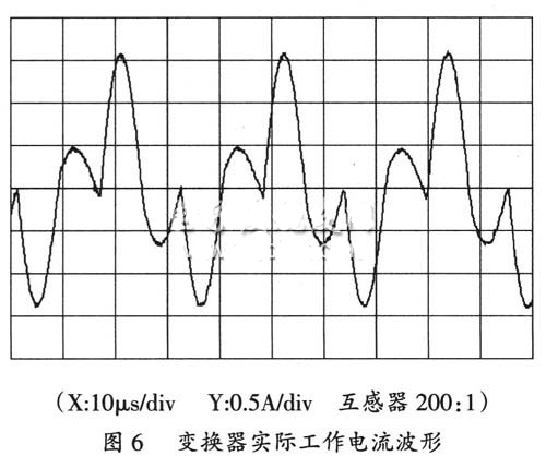 整個變換器電路依然采用PFM的工作模式,當前級預穩電源輸出0~500V直流電壓時,變換器以固定的脈沖寬度驅動橋臂的功率開關管。為了保證電源在電子槍束流產生時能穩定工作,設計了取樣閉環控制功能,當輸出偏離電壓設定值時,變換器通過脈沖頻率調節得到穩定的輸出,電子槍高壓電源實際工作頻率為3~25kHz。改進后的串聯諧振變換器如圖5所示,變換器的實際工作電流波形如圖6所示。