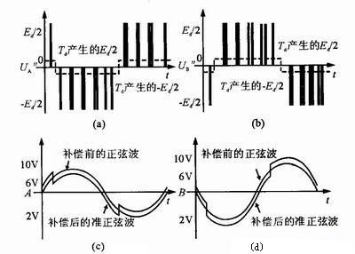 在死區(qū)時間內(nèi),由于續(xù)流的緣故輸出電壓波形發(fā)生了畸變,通過對波形進(jìn)行等效的補(bǔ)償可以得到準(zhǔn)正弦波。推理和實驗均證明該方法能較好地對逆變器橋路輸出電壓進(jìn)行補(bǔ)償。該方法簡單實用,易于實現(xiàn),具有一定的工程使用價值。
