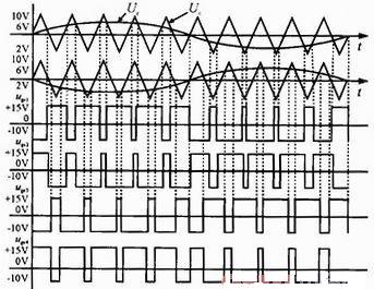 本文采用調(diào)制法產(chǎn)生PWM波形,采用等腰三角波作為載波,因為等腰三角波上任一點的水平寬度和高度成線性關(guān)系且左右對稱,當(dāng)它與任何一個平緩變化的調(diào)制信號波相交時,如果在交點時刻對電路中開關(guān)器件的通斷進(jìn)行控制,就可以得到正比于信號波幅值的脈沖,這正好符合PWM控制的要求。