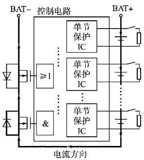 系統(tǒng)中控制電路部分單節(jié)鋰電池保護(hù)芯片的充電過電壓保護(hù)控制信號(hào)經(jīng)光耦隔離后并聯(lián)輸出,為主電路中充電開關(guān)器件的導(dǎo)通提供柵極電壓;如某一節(jié)或幾節(jié)鋰電池在充電過程中先進(jìn)入過電壓保護(hù)狀態(tài),則由過電壓保護(hù)信號(hào)控制并聯(lián)在單節(jié)鋰電池正負(fù)極兩端的分流放電支路放電,同時(shí)將串接在充電回路中的對應(yīng)單體鋰電池?cái)嚯x出充電回路。