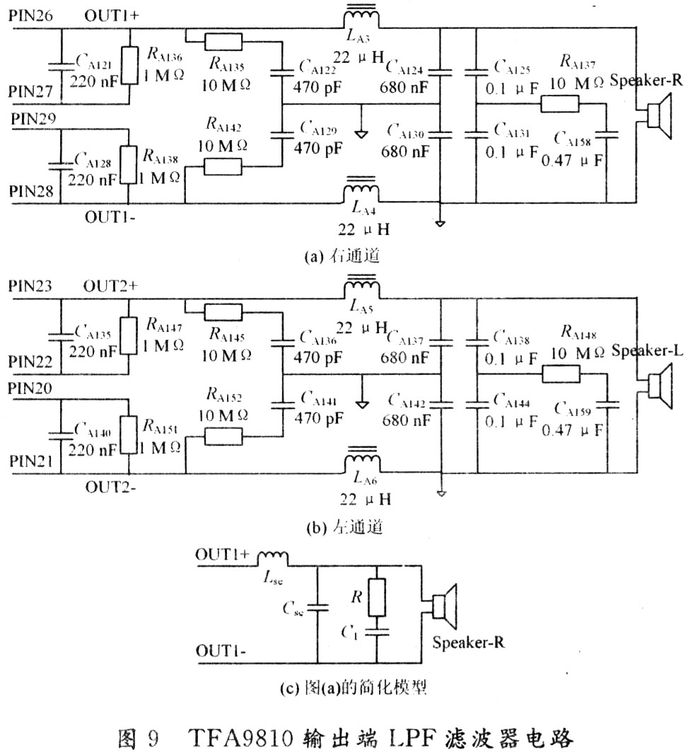 TFA9810T輸出端低通濾波器采用二階巴特沃思濾波器方式,實際的巴特沃思二階濾波器由圖9中RCA類電子元器件CA135/RA145/CA136/LA5/CA137/CA138/RA148/CA159/CA140/CA141/RA152/LA6/CA142/CA144等構成,對PWM方波中15 Hz~20 kHz音頻成分表現為直通效應,對超過音頻范圍的20 kHz以上高頻成分呈現-12 dB/倍頻程滾降率。