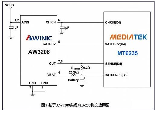 上海艾為電子專門針對MT6235/36平臺推出的AW3208在增加OVP功能的同時,提供了智能充電功能,以滿足快速充電的功能。如圖2所示,AW3208內置專有的K-ChargeTM技術,可根據芯片溫度智能調整輸出電流,以保證在充電期間整個充電系統的安全。使得手機在實現快速充電的時候不會因為由于環境溫度較高或者充電電流過大導致芯片進入過溫保護使得充電沒法正常進行。圖3為在MT6235上的典型應用圖。