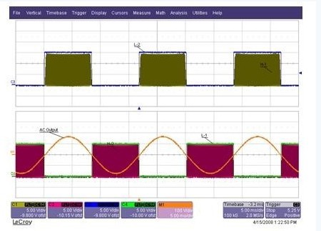 為滿足這個要求,IGBT可在20kHz或以上頻率的情況下,對50Hz或60Hz的頻率進行脈寬調制,因此輸出電感器L1和L2便可以保持合理的小巧體積,并能有效抑制諧波。此外,由于其轉換頻率高出人類的正常聽覺頻譜,因此該設計也可盡量減少逆變器產生的可聽噪聲。