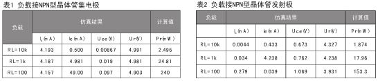 為了說明晶體管負載的不同接法對驅(qū)動電路的影響,我們借助Multisim 10 仿真軟件分析負載電阻為100、1k、10k 情況下圖3(a)、(b)中電路的各個參數(shù),得到的仿真結(jié)果如表1 和表2 所示。