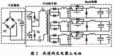 改進的新型充電器主電路,如圖2所示。前級采用軟開關不對稱半橋實現了多路的隔離輸出,并且利用自身產生的寄生參數,實現諧振式零電壓軟開關以此減小開關的損耗,同時也避免了因變壓器漏感而帶來的電壓尖峰。后級采用成熟簡單的Buck電路拓撲,實現降壓并用此來滿足三段式充電的要求。