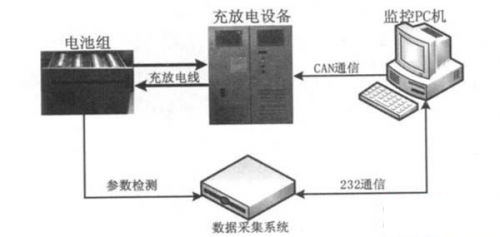 測(cè)試平臺(tái)的結(jié)構(gòu)如圖1所示,以單片機(jī)為核心的電池?cái)?shù)據(jù)采集系統(tǒng)直接對(duì)電池組的單體電壓、總電壓、溫度、電流、充放電容量、充放電能量等信息進(jìn)行精確測(cè)量,并通過RS232總線將數(shù)據(jù)發(fā)送到上位機(jī)。由微型計(jì)算機(jī)構(gòu)成的上位機(jī)監(jiān)控系統(tǒng), 實(shí)時(shí)顯示并記錄接收到的測(cè)試數(shù)據(jù), 對(duì)數(shù)據(jù)進(jìn)行分析,監(jiān)控測(cè)試系統(tǒng)工作狀態(tài)。另外可根據(jù)具體的實(shí)驗(yàn)要求,控制充放電設(shè)備按照編程指令輸出電流,模擬電池在某些特定條件下的使用情況。充放電設(shè)備實(shí)現(xiàn)電池組的充放電, 完成電池和電網(wǎng)之間能量的雙向流動(dòng), 與監(jiān)控PC 機(jī)通過CAN 通信, 可接收監(jiān)控PC機(jī)的編程控制指令。文中主要完成數(shù)據(jù)采集系統(tǒng)、上位機(jī)監(jiān)控系統(tǒng)的設(shè)計(jì)并實(shí)現(xiàn)各部分之間的實(shí)時(shí)通訊。