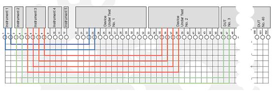 就拿前面提到的那個例子來說,采用這種矩陣排列方式只需要330個測試點(300個待測設備接入點和30個測試裝置接入點)以及8條Y向連接線即可,一共需要2640個繼電器,僅為上面提到的那種排列方法需要300乘30個點的繼電器數量的30%。這樣就可以在開關系統中節省了很大的開支。