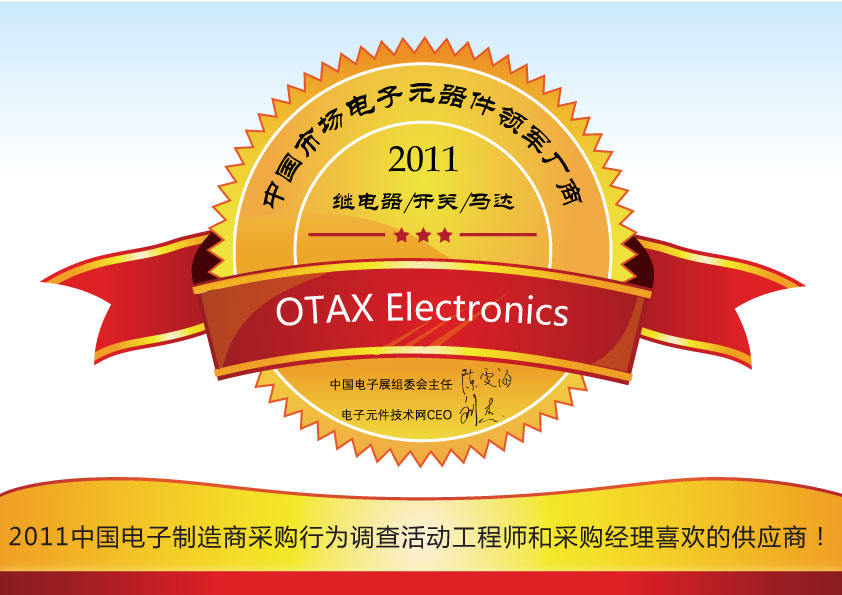 在近日剛剛結束的2011中國電子制造商采購行為調查暨中國市場電子元器件領軍廠商的評選活動中,OTAX Electronics憑借持續穩定的產品、技術和服務等多方面優勢,以及在工程師心目中形成的良好形象,一舉榮獲2011中國市場電子元器件(繼電器/開關/馬達類)領軍廠商稱號!