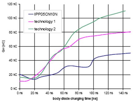 對于優化能效,MOSFET內部的體二極管具有關鍵作用。在每個開關循環中,在MOSFET被關斷之前,體二極管通常會通電,反向恢復電荷Qrr*也由此積聚起來。在第3節中已經提到,數據手冊中所載Qrr與實際Qrr*有所出入。數據手冊中的值是按di/dt為100 A/μs測得的,二極管被施以最高漏極電流,并且MOSFET關斷前的導通時間長達500 μs左右甚至更長。因此,所測得的值是盡可能最高的Qrr*。此外,JEDEC標準所規定的測定方法不僅包含了Qrr*,而且包含MOSFET的部分輸出電荷,因而得到的總值很高,與實際值不相符。需要強調的是,雖然在實際應用中,di/dt可能高達1000 A/μs,并且di/dt越高,Qrr*也越高。但是,Qrr*主要取決于電流和二極管導通時間。由于在實際應用中,電流僅為最高漏極電流的一半甚或更低,并且二極管導通時間僅為50 ns至150 ns,因此實際Qrr*值比數據手冊中的值低得多。