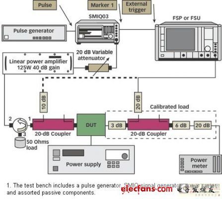 測試臺(圖1)使用一個與SMIQ RF信號發(fā)生器“脈沖”輸入相連接的脈沖發(fā)生器。為了在功率掃描模式中使用SMIQ,功率掃描必須與信號分析器中的時基掃描同步。幸好,當與二極管檢測器和類似XY模式濾波鏡的顯示器相關(guān)聯(lián)時,這一類信號發(fā)生器具有可以被用作純量網(wǎng)絡(luò)分析儀(SNA)的特性。在SMIQ的后部面板上,有幾個帶有功率掃描斜線以驅(qū)動濾波鏡的X軸的BNC連接器,以及校準顯示器X軸的標記。既然這樣,“標記”的輸出被當作信號分析器的觸發(fā)信號來使用。