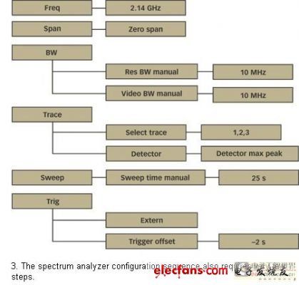 正如已經(jīng)提到的一樣,頻譜分析器在“零檔”模式下使用。不論是分辨率帶寬還是視頻帶寬,均設(shè)為10MHz,因為頻譜分析器被用來測量峰值功率。基于同樣的理由,檢測器必須在“最大峰值”模式下設(shè)置。選取25s的掃描時間以便獲得對屏幕的整體掃描。選擇外部觸發(fā)器的可選項。利用“觸發(fā)器偏差”特性將屏幕上的軌跡置于中心也是一種明智的選擇。-2s即是合適的。圖3顯示了詳細的配置序列。