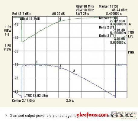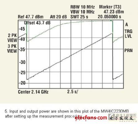 用于頻譜分析器的功能序列顯示在圖4中。此刻,頻譜分析器連接到輸入,且輸入功率在第二條線跡(線跡2)獲取,并保持在“觀察”模式。圖5中的黑色線跡即得。當在輸出再連接分析器之后,從第三條線跡(線跡3)獲得輸出功率,同樣也保持在“觀察”模式。通過設(shè)置“輸出偏差”值的參數(shù)等級偏差,該值在校準階段被設(shè)為43.7dB,從“線跡3”可以直接讀取以dBm為單位的絕對輸出功率,圖5中的綠線即得。通過在鋸齒末端的平面區(qū)域安置標記,可以讀取如圖5 中綠線所示的飽和功率。MW4IC2230MB顯示+47.23dBm的飽和功率。