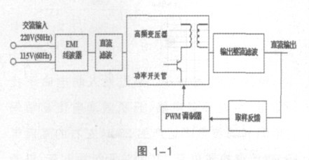 接入交流電網(50Hz ,220V AC 或者115VAC)經EMI 防電磁干擾電源線濾波器,直接整流濾波變成直流,再經變換器將直流電壓(275V 或172V)變換為數十KHz 或數百KHz的高頻方波或準方波電壓控制功率開關管,經高頻率變壓器隔離、降壓(或升壓),再經高頻整流濾波后輸出直流電壓,經取樣、比較、放大控制PWM 調制器驅動功率開關管的占空比。從而可以得到穩定的輸出電壓。