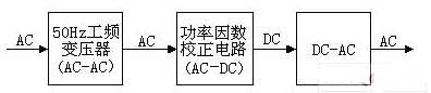 1. 三級構成方案Ⅰ。其結構如圖3所示。第一級是50Hz工頻變壓器,用來實現電氣隔離功能,從而保證電源設備的安全性,免受來自高壓饋電線的危險。第二級是功率因數校正電路,用來強迫線電流跟隨線電壓,使線電流正弦化,提高功率因數,減少諧波含量,其輸出是400V左右的高壓直流。第三級是DC-AC模塊,用來實現逆變功能,即通過控制逆變電路的工作頻率和輸出時間比例,使逆變器的輸出電壓或電流的頻率和幅值按照人們的意愿或設備工作的要求來靈活地變化。