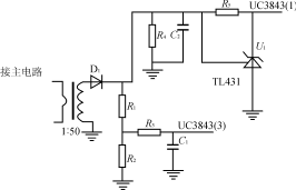 電流反饋電路采用電流互感器檢測開關管上的電流,原理如圖2所示。電流互感器的輸出分為電流瞬時值反饋和電流平均值反饋兩路,R2上電壓反映電流瞬時值,開關管上的電流增大會使UR2增大,當UR2大于1V時,UC3843芯片輸出脈沖關斷。調節R1、R2分壓比可改變開關管的限流值,實現電流瞬時值的逐周期比較,這屬于限流式保護。輸出脈沖關斷,實現對電流平均值的保護,這屬于截流式保護。兩種過流保護互為補充,使電源更為安全可靠。采用電流互感器采樣使控制電路與主電路隔離,同時與電阻采樣相比降低了功耗,有利于提高整個電源的效率。