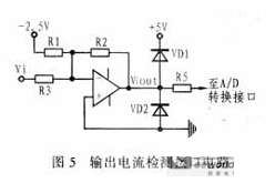 ADMC331內的A/D轉換器由7個模擬輸入通道和比較器等電路組成,數據轉換是通過判斷模擬輸入量與片內高穩定度鋸齒波的交點來實現的??紤]到A/D 轉換器能接受的電平范圍為0~+5V,因此必須將電壓互感器檢測的電壓和電流傳感器檢測的電流(轉換為電壓量)按照一定比例轉換到這個范圍內。輸出電壓和電流檢測接口電路分別如圖4和圖5所示,這部分電路的輸入阻抗應比較大,以盡量減少對設備信號的影響,并且輸出阻抗應同A/D轉換器的輸入阻抗相匹配。