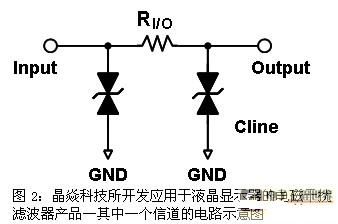晶焱科技(Amazing Microelectronic Corp.)在靜電放電防護技術上已累積了豐富的經(jīng)驗與技術。公司開發(fā)的應用于液晶顯示器的電磁干擾濾波器產(chǎn)品基本架構(gòu)如圖2所示。由圖2電路示意圖可知:π型低通濾波器的Input與Output之間是采用電阻(RI/O)組件橋接,Input端點及Output端點對GND的電容則是采用雙向?qū)?bi-directional)的瞬時電壓抑制器(TVS)。因此,該系列產(chǎn)品除了可以提供良好的低通濾波效果之外,還擁有很好的靜電放電防護效果。