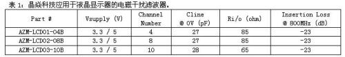 表1所列為晶焱科技已推出的應用于液晶顯示器的電磁干擾濾波器系列產(chǎn)品。適用于5V以下的額定電壓電路系統(tǒng),線電容值約為27微微法拉(pF)。操作頻率在800百萬赫茲(MHz)時,其功率損耗可達-23dB,可以顯著地降低電磁干擾信號,以維持受保護電路的操作功能正常。晶焱科技同時推出三種不同通道數(shù)的電磁干擾濾波器產(chǎn)品,以方便其客戶依照不同需求選用合適的產(chǎn)品。