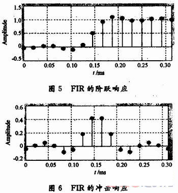 點(diǎn)擊“design filter”即可。值得注意的是,這里選擇filter order為15階,而不是所設(shè)計(jì)的16階濾波器。因?yàn)槌?shù)系數(shù)項(xiàng)h(0)=0。通過菜單“analysis”選擇“magnitude”和“phase response”即可得到圖3,圖4的特性顯示。“analysis”選擇“step response”和“im-pulse”可以得到圖5,圖6的響應(yīng)顯示。可以看出所設(shè)計(jì)FIR濾波器的階躍響應(yīng)和沖擊響應(yīng)比較接近理想狀態(tài)。