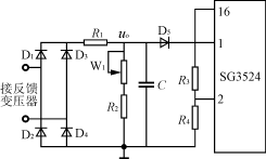反饋調壓電路圖如圖7所示。當逆變器正常工作時,逆變器的輸出信號接反饋變壓器,其二次電壓經整流,濾波,分壓得到反饋電壓uo,顯然,uo的大小正比于逆變器的輸出電壓。調節W1可調節負反饋電壓的大小,從而調節逆變器輸出電壓的幅值。uo控制信號被送到SG3524-1芯片的誤差放大器的反相端腳1。誤差放大器的同相端腳2接參考電平。這樣,SG3524的輸出脈沖的占空比就受到反饋信號的控制。調節過程是這樣的,當逆變器輸出因突加負載而降低時,它會使加在SG3524-1的腳1的輸入反饋電壓下降,這會導致SG3524-1輸出脈沖占空比增加,從而使得Boost電路輸出電壓升高,逆變橋的直流電壓升高,逆變器輸出交流電壓升高。反之亦然。可見,正是通過SG3524-1的脈寬調制組件的控制作用,實現了整個逆變器的輸出自動穩壓調節功能。