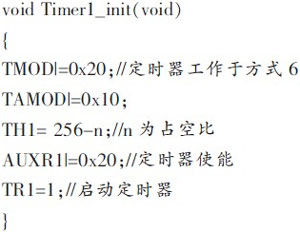 微處理器P89LPC932內部定時器TO/T1的PWM輸出與計數輸入和定時器觸發輸出占用相同的管腳,發生定時器溢出時自動觸發端口輸出。此功能通過AUXR1寄存器中的控制位ENT0和ENT1分別使能定時器0和1。該模式打開時,在首次定時器溢出前端口的輸出為邏輯1。為了使該模式生效,必須清零C/T位以選擇PCLK作為定時器的時鐘源。定時器初始化設置參考程序如下:
