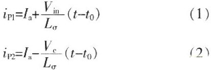 (2)工作模態2[t0-t2] 如圖3(b)所示,t1時刻,D2、D3中反向恢復電流達到最大值,D5、D6導通,D2、D3達到瞬時反向電壓Vo,緩沖電容C1(C2)和副邊漏感Lo’開始諧振。Vin、VC分別加在原邊繞組Np1、Np2上,ip1正向增大,ip2減小并反向增大。
