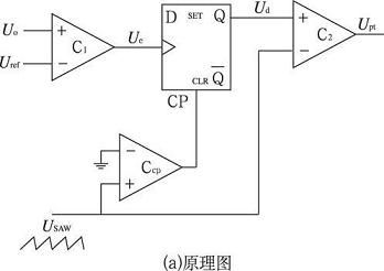本節設計一種簡單實用的脈沖序列控制器, 如圖2 所示。圖2 中時鐘信號CP( Clock Pulse) 由峰峰值為- 10 V到+ 10 V 的鋸齒波信號USAW 與電壓信號UGN D ( UGND = 0) 通過比較器Ccp產生; 變換器輸出電壓Uo 與基準電壓Uref 通過比較器C1 產生電壓信號Ue;觸發器D 在時鐘來臨時刻將電壓信號Ue 傳遞至輸出端Q, 并在下一時鐘來臨之前保持不變; 比較器C2 將D 觸發器的輸出信號和鋸齒波進行比較產生控制脈沖PH 或PL 實現對變換器的控制。