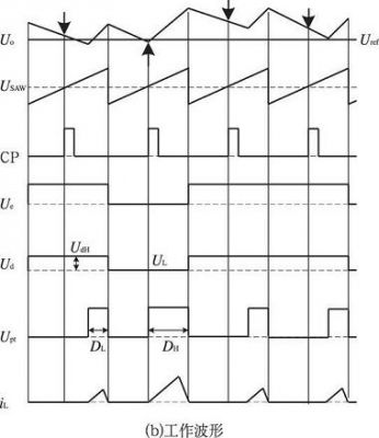 上述PT 控制器的工作過程為: 在開關周期的起始時刻, 時鐘信號CP 來臨, 若此時Uo > Uref , 則Ue 為高電平; 時鐘信號同時使觸發器D 觸發, 觸發器輸出信號Ud 在下一時鐘脈沖來臨前保持高電平不變; 鋸齒波信號USAW 與Ud 經過C2 比較, 輸出占空比為DL的低能量脈沖信號P L.若Uo< Uref , 則Ue 為低電平;觸發器輸出信號Ud 在下一時鐘脈沖來臨前保持低電平不變; 鋸齒波信號USAW 與Ud 比較產生占空比為DH的高能量脈沖信號PH .PT 控制器主要工作波形如圖2( b) 所示。