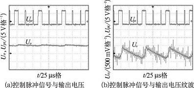 從圖4( a) 中, 可以看出當MOSFET 管導通控制信號為高能量脈沖占空比為DH 時, 輸出電壓Uo 有小幅上升;而MOSFET 管導通控制信號為低能量脈沖占空比為DL 時, 輸出電壓Uo 有小幅下降, 與仿真波形圖一致。在圖4( b) 中,可觀察輸出電壓Uo 的紋波圖, 能夠更清楚地反映開關管導通控制信號與輸出電壓的變化關系。從圖中,可以更加明顯看到開關管導通控制信號的變化對輸出電壓的影響, 與仿真結果基本一致。