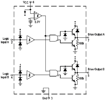 MC34152的外圍電路簡單,應(yīng)用方便。它是8管腳的同相推挽驅(qū)動芯片,具體的內(nèi)部結(jié)構(gòu)和封裝如圖4所示。2,4腳為兩路控制信號輸入,經(jīng)過芯片內(nèi)部的推挽放大,直接輸出同相的兩路驅(qū)動信號(7,5腳)。為使芯片更加穩(wěn)定地工作,一般在芯片的電源端并聯(lián)一個濾去高頻干擾的瓷片電容和一個濾去低頻干擾的電解電容。