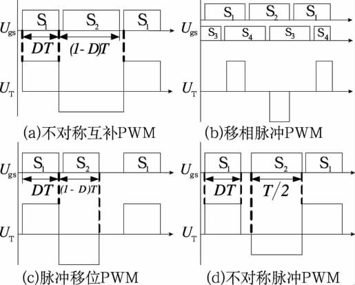 控制型軟開關半橋DC/DC變換器不增加主電路元器件(可增加電感電容元件以實現軟開關條件),通過合理設計控制電路來實現軟開關。圖1給出4種控制型軟開關半橋DC/DC變換器的PWM 控制策略。