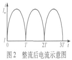 在開(kāi)關(guān)電源中, 工頻交流電流經(jīng)過(guò)整流橋后, 不再是單一頻率點(diǎn)的交流電流, 而是單向的脈動(dòng)直流電流,其波形如圖2所示, 利用傅里葉變換可得: