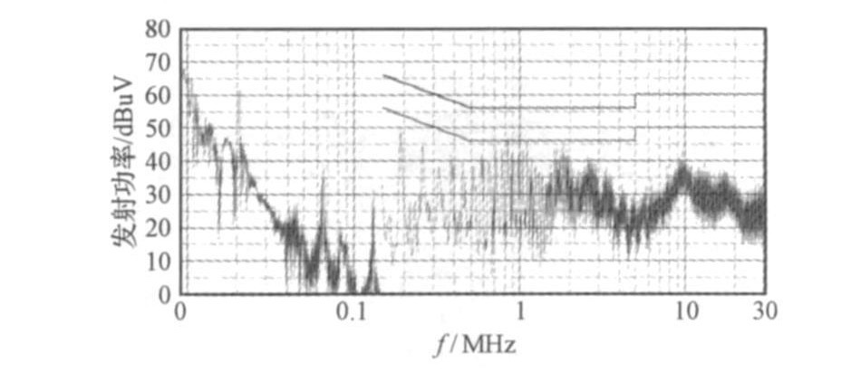 一鎳氫電池充電器產(chǎn)品, 額定功率5W.在其出廠前, 用實(shí)驗(yàn)室設(shè)備(人工電源網(wǎng)絡(luò)為PMM L2??16A,EM I接收機(jī)為PMM9010) 對(duì)其進(jìn)行預(yù)測(cè)試, 采用的測(cè)試標(biāo)準(zhǔn)為GB55014,,其結(jié)果如圖4所示。