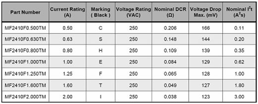 MF2410雖然體積嬌小,但分斷能力達到100A@250VAC,同時DCR很低,是目前全球市場上能夠滿足IEC60127-4標準,最小體積的250VAC貼片保險絲。