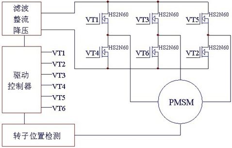 方案中無(wú)刷直流電機(jī)(BLDCM)輸入(110V/220V)交流電,經(jīng)轉(zhuǎn)換器(converter)轉(zhuǎn)成直流,要轉(zhuǎn)入電機(jī)線(xiàn)圈前須先將直流電壓由換流器(inverter)轉(zhuǎn)成3相電壓來(lái)驅(qū)動(dòng)電機(jī)。換流器(inverter)由6個(gè)功率MOSFET(VT1~VT6)分為上臂(VT1、VT3、VT5)/下臂(VT2、VT4、VT6)連接電機(jī)作為控制流經(jīng)電機(jī)線(xiàn)圈的開(kāi)關(guān)。MCU提供PWM(脈沖寬度調(diào)制)決定功率MOSFET HS2N60IB開(kāi)關(guān)頻度及換流器(inverter)換相的時(shí)機(jī)。